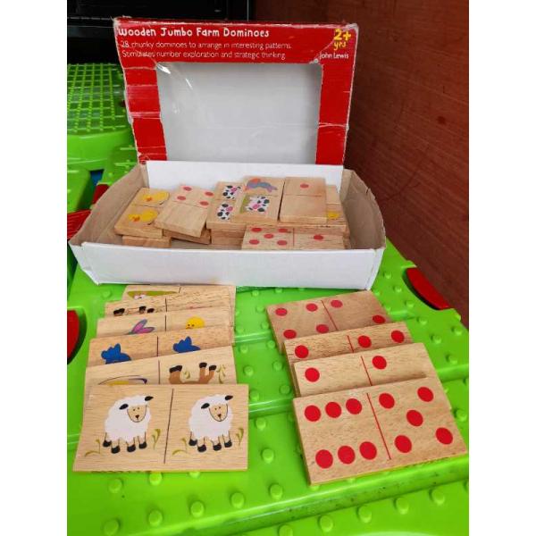 Wooden jumbo dominoes. 27 chunky dominoes features both animal designs and traditional dotted pattern.